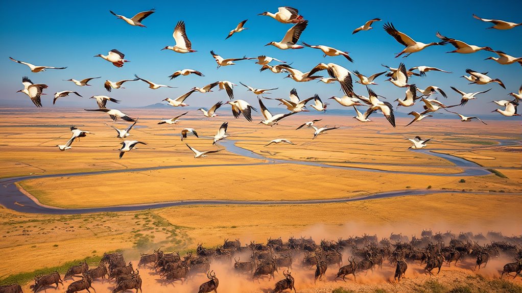 You can’t migrate successfully without reliable navigation, so animals rely on celestial cues like the sun and stars to chart their courses. They also use environmental landmarks such as rivers and mountains to stay on track during long journeys. Additionally, social learning helps many species improve their navigation, as they follow experienced individuals or groups to reach their destinations efficiently. Understanding emotional support can also be crucial for animals facing stressful migration conditions, helping them cope with the challenges of their journeys. Recent studies highlight how AI-powered tracking enhances our understanding of migratory routes, enabling conservation efforts to better protect these incredible journeys. Incorporating biodiversity hotspots into conservation strategies ensures the protection of critical migratory pathways for many species. Recognizing migration patterns aids researchers in identifying key stopover sites that are essential for the survival of migratory species. Moreover, advances in technology reveal how environmental cues are vital for guiding animals across vast distances, especially in changing climates.