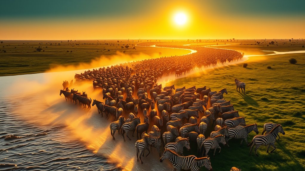 Every year, animals travel thousands of miles to find fresh water, food, and safe breeding grounds. They rely on environmental cues like rain smell, thunder, sun, stars, and magnetic signals to guide them. Herds face challenges at crossing points like the Mara River and Grumeti River, using natural instincts and adaptations to survive. To understand what fuels this incredible journey and how they navigate, explore how migration shapes ecosystems and animal survival.
