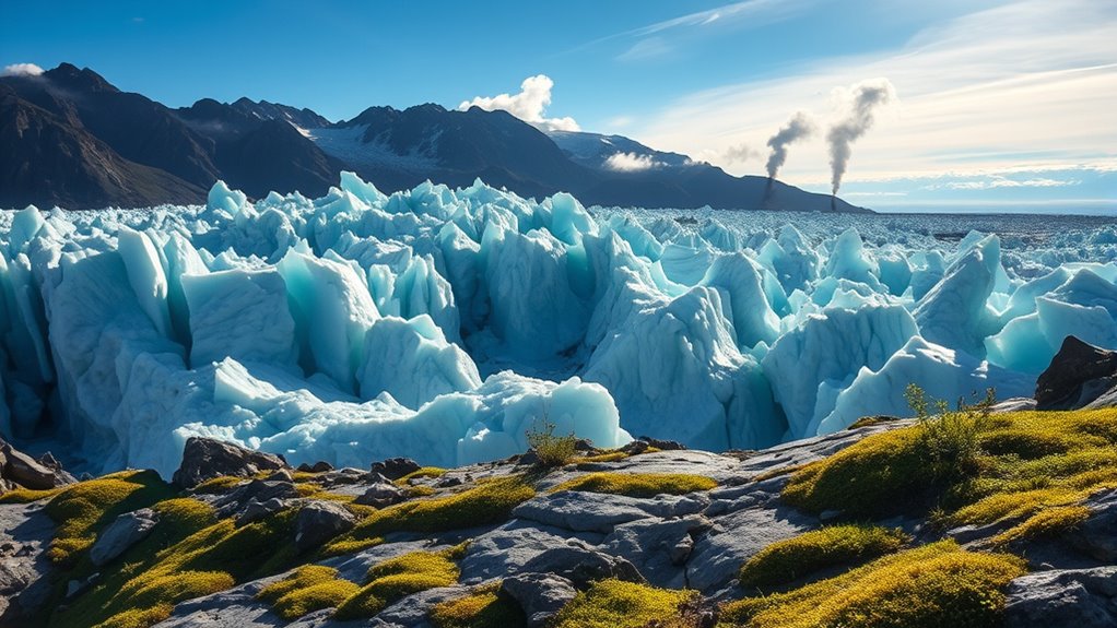 Ever wondered how greenhouse gases influence Earth’s climate system? These gases, like carbon dioxide and methane, trap heat in the atmosphere, creating a natural greenhouse effect that keeps our planet warm enough to support life. However, human activities, especially burning fossil fuels, have markedly increased greenhouse gas levels, intensifying this effect. This extra heat leads to global warming, which disrupts the climate system’s balance. As temperature rises, we see melting ice caps, rising sea levels, and more extreme weather events. The increased greenhouse gases also alter atmospheric and oceanic circulation patterns, affecting weather and climate worldwide. Fundamentally, human emissions have amplified the natural greenhouse effect, driving climate shifts that impact ecosystems, economies, and communities globally.