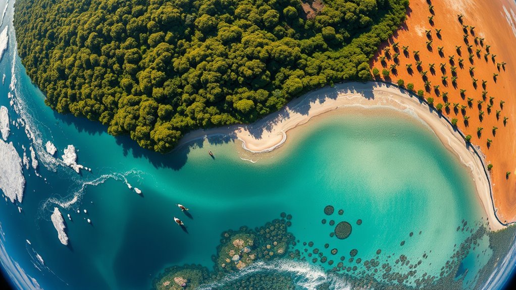 Tropical rainforests are indispensable to the health of our planet because they act as the Earth’s lungs, producing a significant portion of the world’s oxygen. Located near the equator, these forests thrive with warm temperatures and heavy rainfall, often exceeding 200 cm annually. You’ll find towering trees forming a dense canopy that filters sunlight, creating a layered environment rich in life. These forests support extraordinary biodiversity, hosting primates, birds, insects, and countless plant species. Their complex ecosystems regulate local climate, stabilize soil, and absorb carbon dioxide. Protecting these essential biomes is imperative to maintaining global ecological balance and ensuring the survival of countless species. Additionally, sustainable conservation efforts are critical to counteract threats like deforestation and human activity.