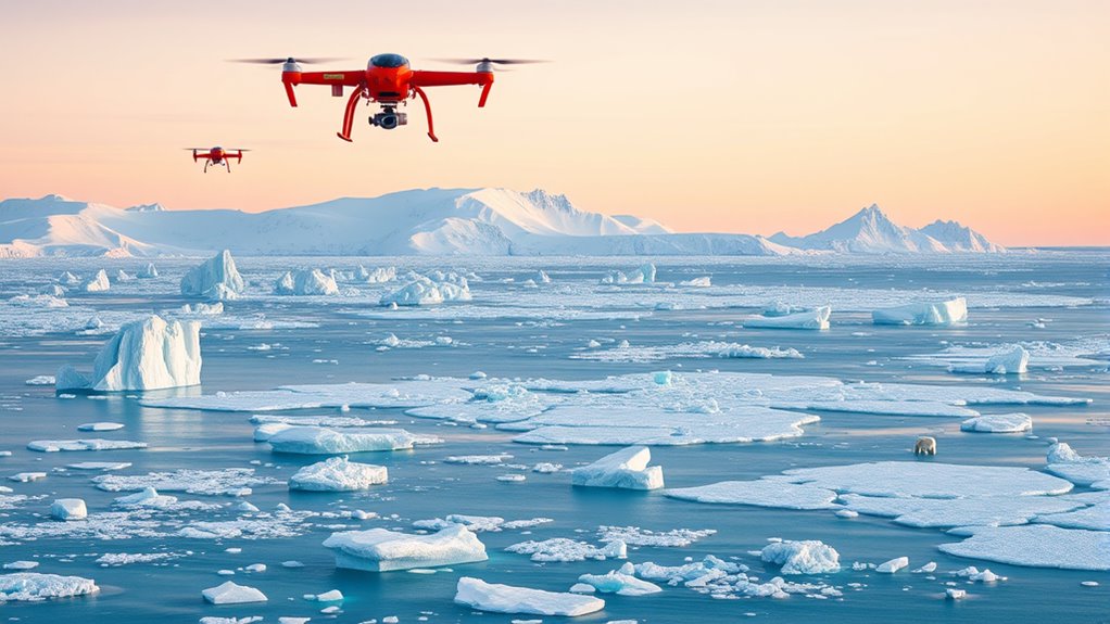 You might be surprised to learn that Arctic sea ice loss creates powerful feedback loops that speed up melting. For instance, as ice diminishes, the Earth’s surface becomes darker, absorbing more sunlight—this is called the albedo effect. This additional heat accelerates ice melt further, reinforcing the cycle. These feedbacks make the Arctic’s decline even more rapid, contributing markedly to global warming and climate instability.