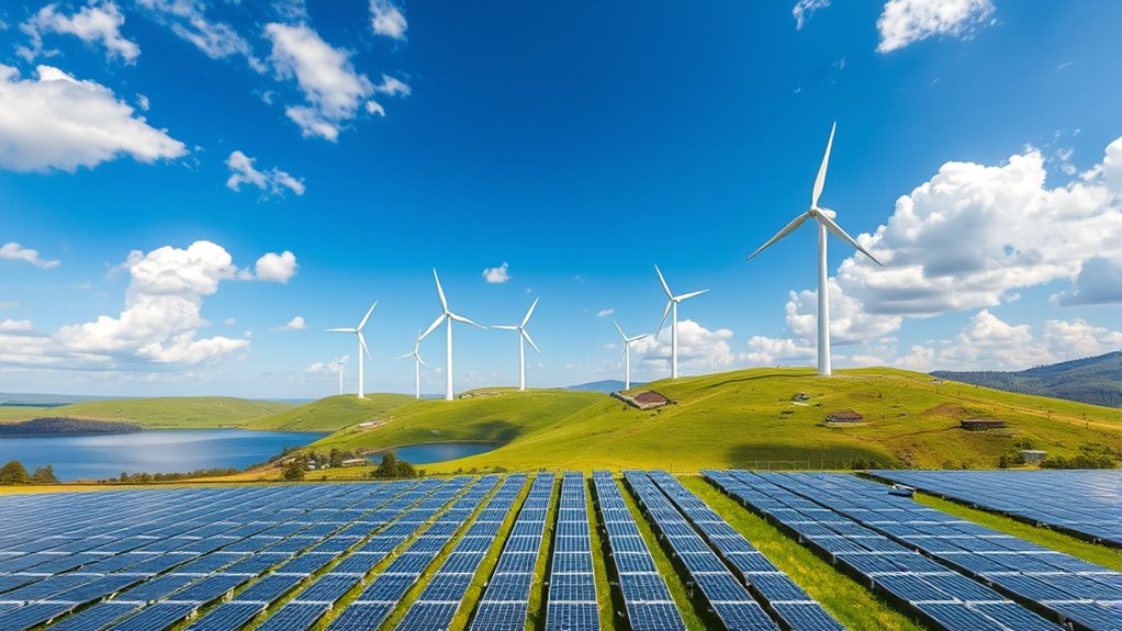Switching to a renewable-dominant grid delivers significant environmental and economic benefits that can transform your community and economy. By replacing fossil fuels, you reduce greenhouse gas emissions, helping combat climate change and improve air quality. This shift also decreases dependence on volatile fossil fuel markets, stabilizing energy prices and creating cost savings for consumers and businesses alike. Investing in renewables generates local jobs in manufacturing, installation, and maintenance, boosting your local economy. additionally, renewable energy sources like solar and wind are abundant and sustainable, ensuring a long-term energy supply that’s resilient against supply disruptions. As renewables expand, your community can enjoy cleaner air, lower energy costs, and economic growth driven by sustainable infrastructure investments.