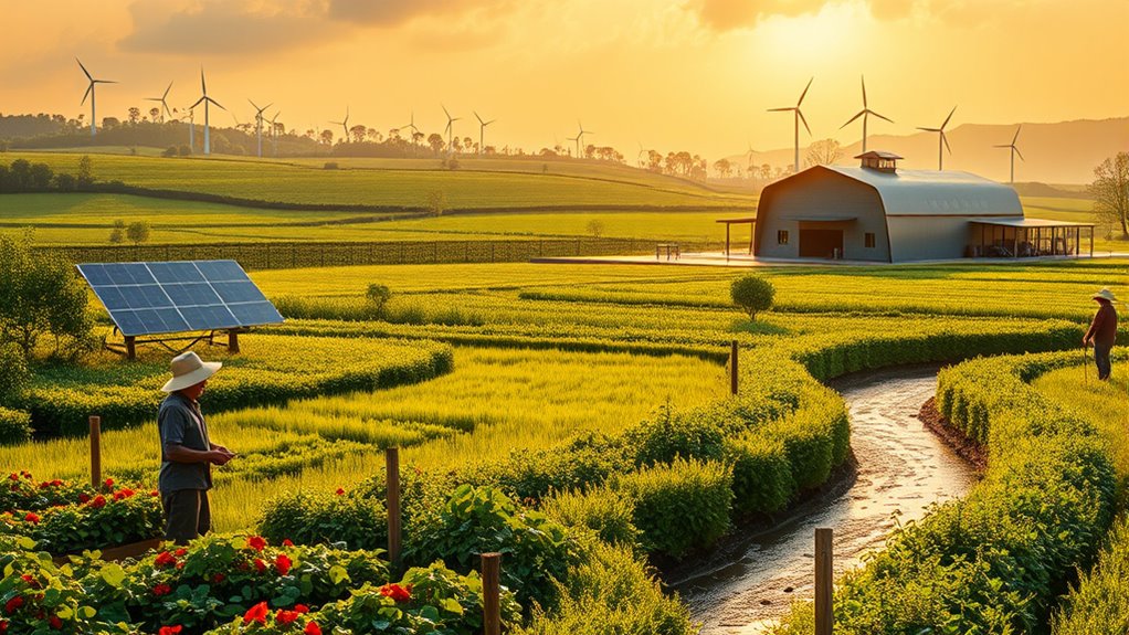 The adoption of sustainable practices in global farming is accelerating as farmers and policymakers recognize their benefits for food security and environmental health. You’re likely to see more farms adopting regenerative soil methods that rebuild soil health, enhance yields, and withstand climate impacts. Precision agriculture, using AI, satellite data, and IoT, is becoming common, helping you use resources more efficiently and cut waste. These practices not only improve productivity but also markedly reduce greenhouse gas emissions—up to 20% globally by 2025. Governments are supporting responsible farming through regulations and environmental assessments, making sustainable methods more accessible. Consumer demand for local, organic, and responsibly sourced food is also pushing farms toward greener practices, creating a positive cycle of environmental and economic benefits. Additionally, integrating herbal teas and other natural products into farming practices can promote soil health and reduce reliance on chemical inputs, further supporting sustainability efforts.