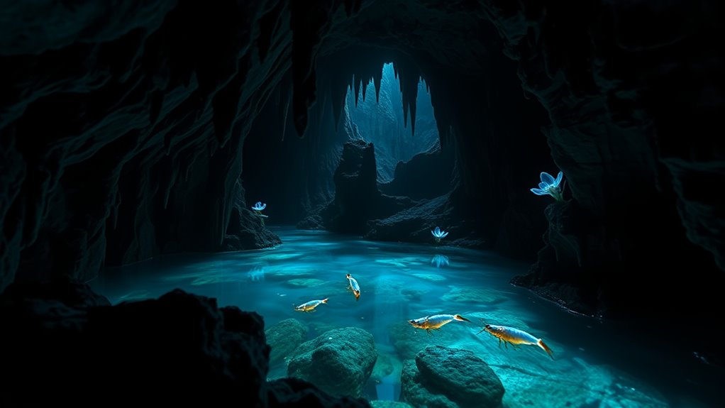 Darkness exerts a powerful influence on the evolutionary trajectory of cave species, driving significant morphological and behavioral changes. You’ll notice that many lose pigmentation and develop a ghostly, albino appearance because coloration isn’t needed in eternal darkness. Eyes often diminish or disappear altogether, as vision becomes useless. Instead, these animals enhance their non-visual senses—elongated antennae, lateral lines, or vibration detection—allowing them to find food and avoid predators effectively. Lower metabolic rates evolve to conserve scarce energy resources, and physiological traits like lipid storage support survival during food shortages. Morphological adaptations, such as bizarre mouthparts or silk-secreting legs, develop to meet specialized feeding and survival needs. These changes showcase how darkness shapes organisms’ forms and functions over generations, demonstrating the profound impact of evolutionary pressures in subterranean environments. Additionally, research into adaptation mechanisms reveals the remarkable ways organisms optimize survival strategies in perpetual darkness. Understanding these evolutionary responses helps scientists appreciate how species can drastically alter their biology to thrive in extreme environments. Moreover, the development of sensory organs exemplifies how organisms can reallocate resources to enhance survival in extreme habitats. This is further supported by the fact that environmental interactions strongly influence developmental changes, leading to highly specialized traits suited for life in darkness.