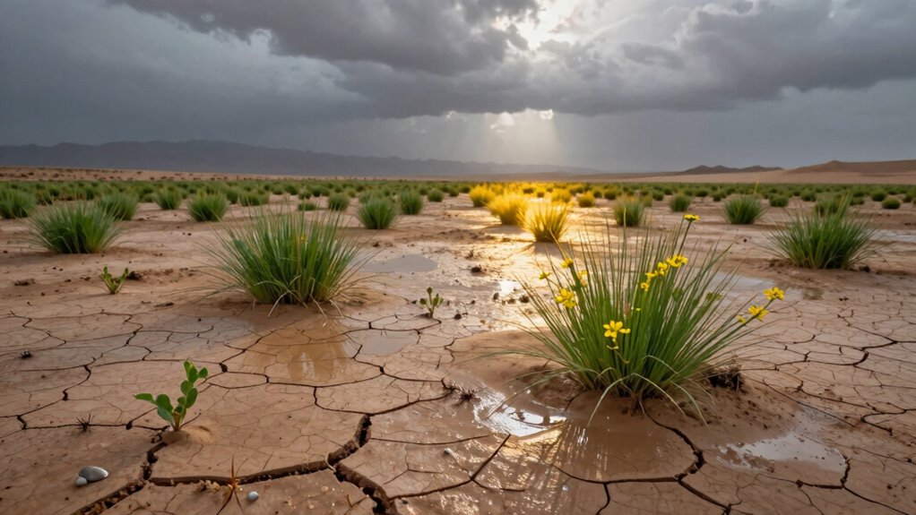 You might be surprised to learn that a single desert rain can trigger a burst of life, with some plants sprouting just days after the storm. In fact, during rare desert rains, scientists have observed up to a 200% increase in local insect activity within 24 hours. It’s incredible how one storm can transform an arid landscape into a thriving ecosystem almost overnight, reminding you of nature’s resilience and the delicate balance that sustains life even in the harshest environments.