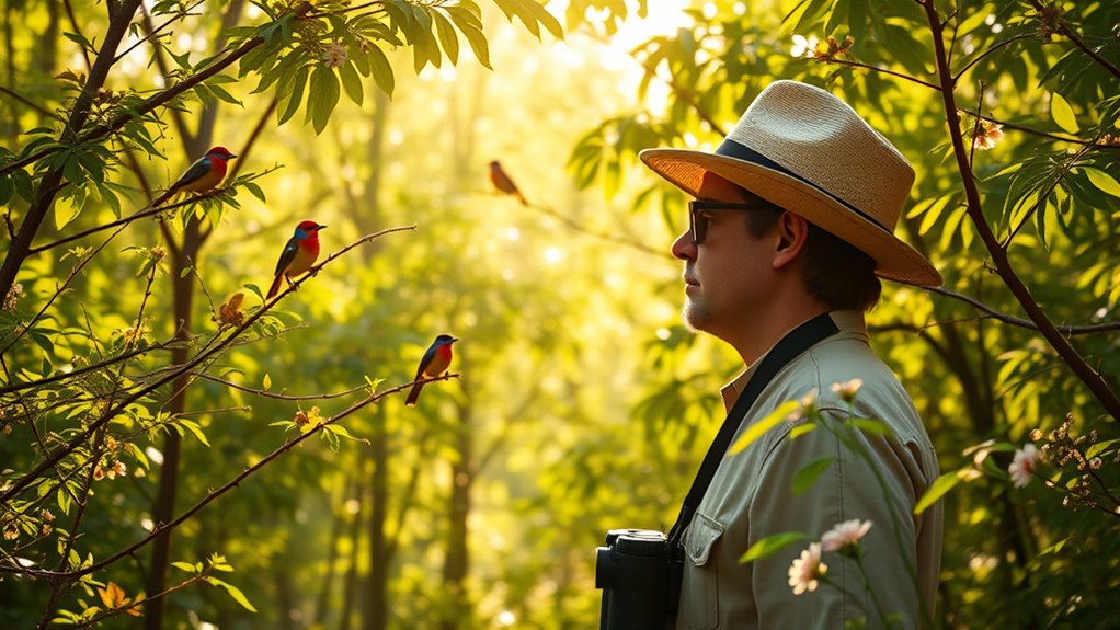 Birdwatching is a joyful, calming hobby that helps you connect deeply with nature. With just a few simple tools like binoculars and field guides, you can start spotting local birds right in your backyard or nearby parks. Paying attention to colors, shapes, and sounds sharpens your observation skills and creates a mindful, peaceful experience. Keep exploring different techniques and resources, and you’ll discover even more ways to enjoy this rewarding nature activity.