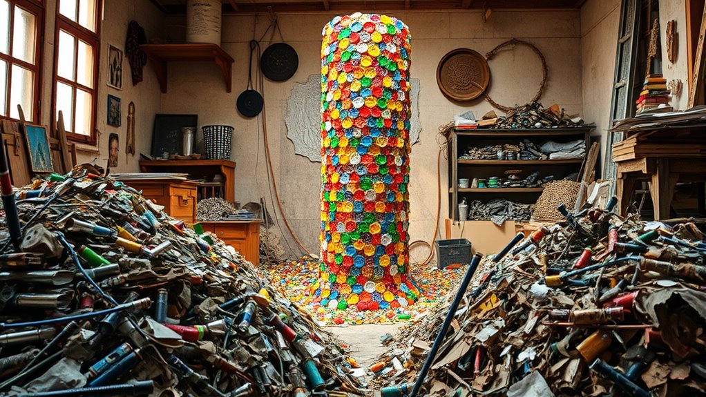 Discover how artists transform waste into inspiring masterpieces by manipulating discarded materials like plastic bottles, cassette tapes, and textiles. They clean, shape, and arrange these objects to create meaningful symbols that reflect cultural values, environmental concerns, and societal stories. This process turns trash into powerful art that raises awareness and encourages change. If you want to uncover more about the creative techniques and impactful stories behind upcycled art, there’s plenty to explore ahead.