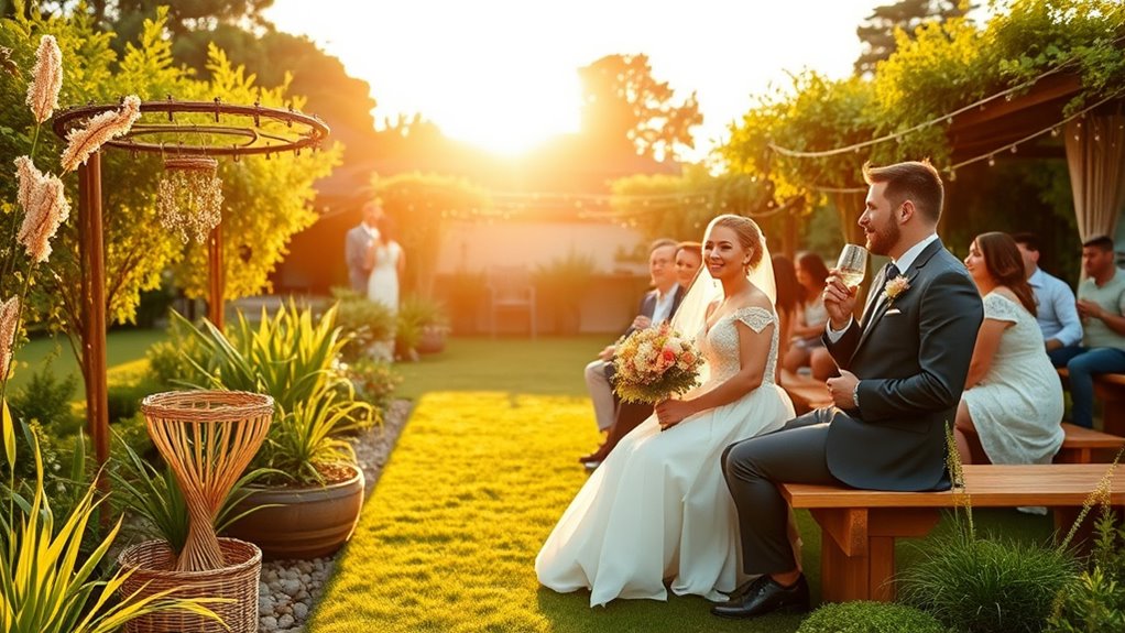 To successfully incorporate sustainable practices into your wedding, engaging your guests is essential. You want everyone to understand their role in reducing waste and supporting eco-friendly choices. Start by sharing your sustainability goals early, so guests feel involved. Encourage them to bring reusable items, like water bottles or coffee cups, and explain the benefits. Offer activities that promote eco-consciousness, such as planting a tree or participating in a cleanup. Set the tone with signage that highlights your green efforts and invites guests to join. Additionally, provide tips for minimizing waste, like avoiding single-use plastics and opting for shared appetizers. Creating a participatory atmosphere ensures your guests are motivated, informed, and excited to contribute to your zero-waste vision.