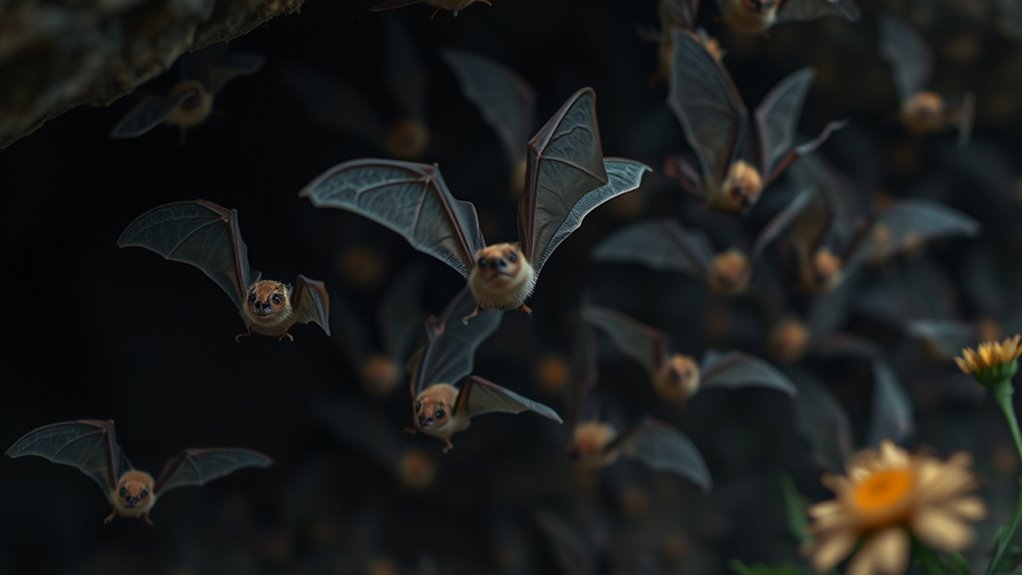 You might wonder how bats find flowers in total darkness. They rely on echolocation, emitting high-pitched sounds that bounce off objects, including flowers. By listening to the returning echoes, bats create a mental map of their surroundings, pinpointing flower locations. Additionally, they are attracted to strong fragrances and large, pale flowers that are easier to spot at night, guiding them directly to their nectar sources.