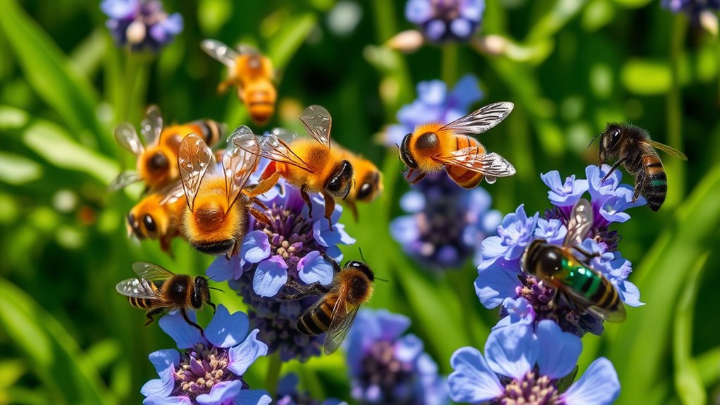 When honey bees dominate floral resources, native bee diversity often declines because they struggle to compete for the same food sources. This shift can change bee communities, leading to fewer native species and altered ecosystem dynamics. Understanding how honey bees influence native bee populations helps us find better ways to protect these essential pollinators. Additionally, promoting native plantings can support diverse bee populations and reduce competition for resources. Implementing pollinator-friendly landscapes further enhances habitat availability for native bees, encouraging their resilience and diversity. Recognizing the importance of vetted security systems can also help safeguard these vital habitats from intruders and threats. Incorporating positive thinking techniques into conservation efforts can foster a proactive mindset essential for addressing ecological challenges and supporting pollinator health.