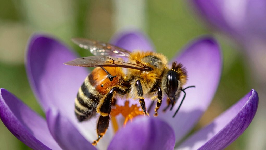 Mason bees don’t typically sting humans. Their behavior focuses on pollination rather than aggression. You’ll find them in habitats like garden beds and orchards, where they collect pollen. Since they’re gentle and not defensive, you can observe them closely without worry. If you leave them alone, they’ll do their important work without bothering you. Just enjoy their presence, knowing they’re beneficial allies for your plants!