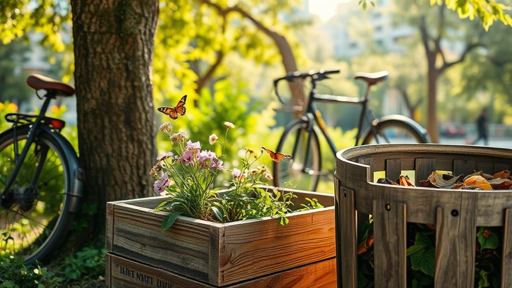 Composting at home is a simple and effective way to reduce organic waste and lower your environmental impact. Instead of sending food scraps to landfills where they produce methane, you transform them into nutrient-rich soil. You can start small with a compost bin in your backyard or use a countertop compost collector for kitchen scraps. Focus on composting fruit and vegetable peels, coffee grounds, eggshells, and yard waste. Avoid meats, dairy, and oils, which can attract pests. Regularly turn your compost to aerate it, speeding up decomposition. Not only does this reduce waste, but it also enriches your garden naturally, cutting down on store-bought fertilizers. Proper composting techniques can maximize nutrient recycling and efficiency. Incorporating composting benefits into your routine can motivate consistent practice. Additionally, choosing the right composting methods can help you achieve the best results for your space and needs. Using a compost thermometer can help you monitor the temperature and ensure proper decomposition, making your compost more effective. Engaging with local biodiversity hotspots and native plants can further enhance your garden’s ecological health. Composting is a rewarding habit that supports a healthier planet while improving your outdoor space.