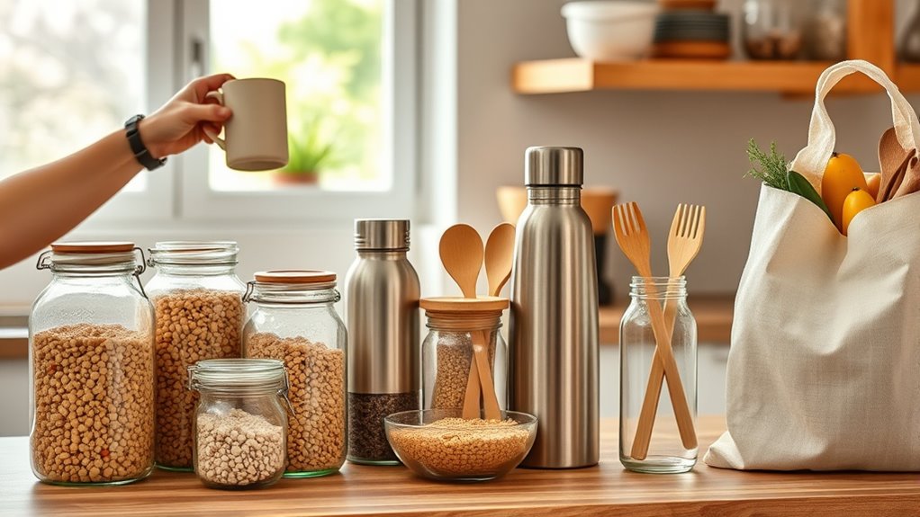 Switching to reusable alternatives is a straightforward way to cut down on single-use plastic waste in your daily life. Start by replacing plastic bottles with a durable, refillable water bottle made of stainless steel or glass. Use cloth bags instead of plastic shopping bags—they’re sturdy and eco-friendly. Swap disposable coffee cups for a reusable mug, which keeps your drink hot and reduces waste. Opt for beeswax wraps or silicone food covers instead of plastic wrap and zip bags. Carry reusable containers for snacks and leftovers, and choose bar soap over liquid soap in plastic bottles. These small changes add up, markedly reducing plastic waste and helping protect the environment. Reusable options are often more durable and cost-effective in the long run, making it easier to maintain eco-friendly habits.