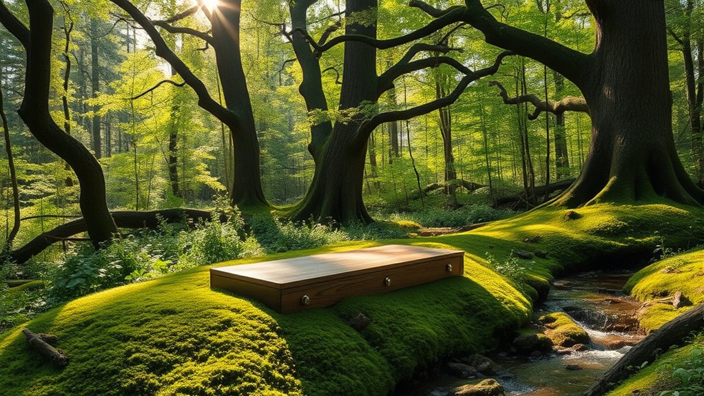 Have you ever considered how traditional funerals often introduce harmful chemicals into the environment? Conventional methods use embalming fluids containing formaldehyde, which can seep into soil and water, causing pollution. Green burials, however, promote chemical-free decomposition processes that occur naturally without toxic substances. When you choose a green burial, your body is allowed to decompose organically, supported by biodegradable materials like natural shrouds and wooden caskets. This process encourages microorganisms, fungi, and bacteria to break down tissue safely, returning nutrients to the earth. Unlike embalming, which delays decomposition and introduces chemicals, natural decomposition happens at its own pace, reducing environmental harm. This chemical-free approach respects nature’s processes, fostering a sustainable cycle of life and death. Additionally, the natural decomposition process aligns with principles of sound design by creating a harmonious cycle that benefits the environment. Incorporating eco-friendly practices into end-of-life choices emphasizes the importance of minimizing ecological impact and supporting ecological balance. Choosing natural decomposition also promotes environmental sustainability, helping to preserve natural resources for future generations. Recognizing these processes can inspire more environmentally conscious choices in other areas of life, further supporting ecological health.