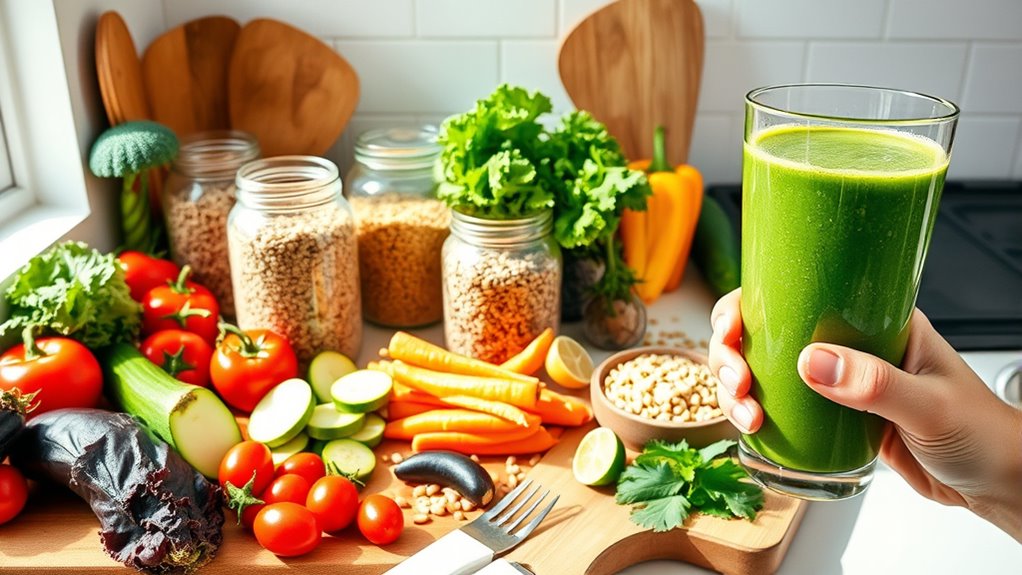 Incorporating nutrient-rich alternatives into your diet is essential for maintaining balanced nutrition while reducing animal product intake. These options help guarantee you get enough protein, vitamins, and minerals without relying on meat or dairy. Start by exploring plant-based proteins like lentils, chickpeas, and tofu, which provide essential amino acids. Incorporate dark leafy greens such as spinach and kale for iron and calcium. Use fortified plant milks to boost vitamin D and B12 intake. Add nuts and seeds like chia, flax, or hemp for omega-3 fatty acids. Finally, include colorful fruits and vegetables to maximize antioxidants and fiber, supporting overall health and vitality. These simple swaps make your transition more sustainable and enjoyable.
