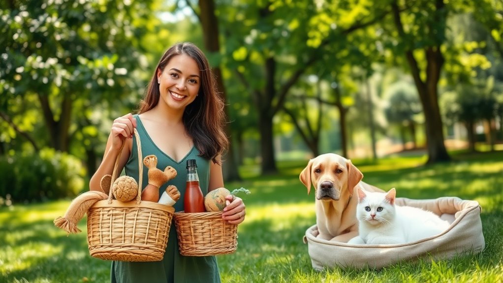 To make eco-friendly choices for Fido and Fluffy, opt for sustainable products like biodegradable poop bags, plant-based pet foods, and toys made from recycled materials. Focus on transparency from brands, looking for certifications and digital traceability to guarantee responsible sourcing. Incorporate routines that reduce waste and avoid harmful chemicals, helping the environment while keeping your pets healthy. Explore these options further to discover how simple swaps can make a big eco-impact.