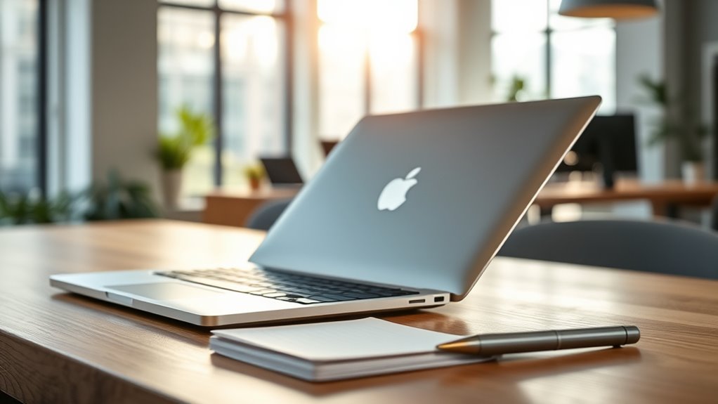 Brighten your workday with a high-resolution Retina display that sharpens every detail, making multitasking seamless. True Tone technology adjusts color warmth for natural viewing, reducing eye strain and enhancing focus. Wide P3 color gamut brings visuals to life with vibrant hues, while anti-reflective coating minimizes glare during bright hours. These features work together like a well-orchestrated symphony, boosting your productivity by providing clarity, comfort, and precision every step of your workflow.