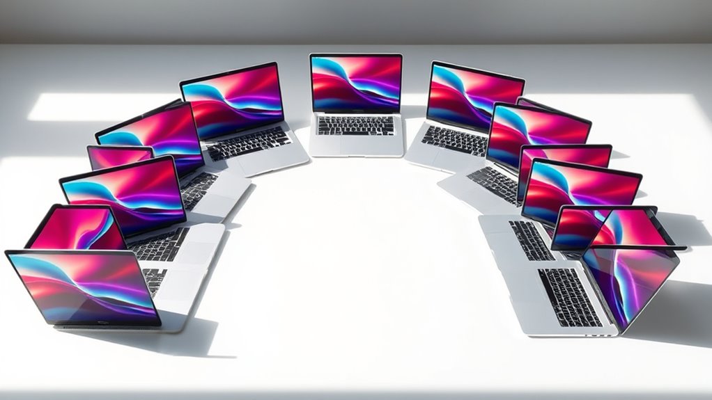 A powerful processor with multiple cores is essential for a 2TB MacBook Air, especially if you plan to multitask or run demanding applications. A 10-core CPU enhances performance across heavy workloads, making multitasking smoother. Modern MacBook Air chips include efficiency cores that optimize battery life while handling routine tasks efficiently. Hardware-accelerated media engines support quick encoding and decoding of formats like ProRes and AV1, streamlining media workflows. Higher GPU core counts, such as 8 or 10 cores, markedly boost graphics performance, ideal for gaming and video editing. Additionally, a larger Neural Engine—16 or 32 cores—amplifies machine learning tasks and overall responsiveness. These features ensure you get a balance of power and efficiency, keeping your MacBook Air responsive without sacrificing battery life.