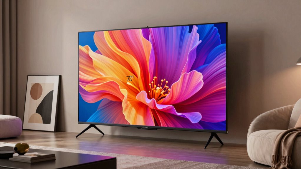 Picture quality features play an essential role in how much you’ll enjoy your 75-inch TV. To get the best image, look for 4K or 8K resolution, which delivers sharp, detailed visuals that really pop on a large screen. Support for HDR formats like Dolby Vision or HDR10+ enhances contrast, brightness, and color accuracy, making images more vibrant and lifelike. Advanced processing technologies such as upscaling and motion smoothing, like MEMC or Motion Rate, help reduce blur during fast scenes, ensuring clarity. Additionally, consider the panel’s color technology—QLED or Mini-LED screens offer broader color gamuts and richer hues. Peak brightness, measured in nits, is also vital, especially in bright rooms or for HDR content, as higher levels improve visibility and picture punch.