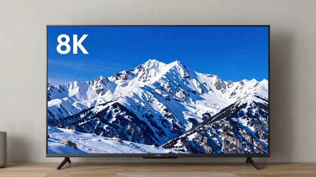 Resolution and upscaling are critical factors to contemplate because they determine how well your 8K TV can deliver sharp, detailed images even with non-8K content. With a native resolution of 7680 x 4320 pixels, 8K TVs offer four times the detail of 4K displays, but much of what you’ll watch isn’t native 8K. That’s where AI upscaling comes in. Advanced neural networks analyze each scene, adding detail and enhancing sharpness, depth, and texture. These algorithms adapt to different content types like movies, sports, or gaming to optimize clarity and realism. High-quality models often feature multiple neural networks, ensuring precise, natural-looking upscaling. This technology makes lower-resolution content look much closer to true 8K, maximizing your viewing experience regardless of the source.