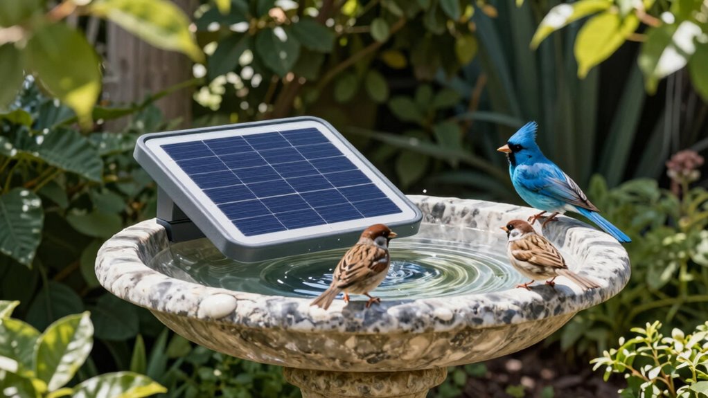 I find that maintaining my solar-powered bird bath is pretty straightforward. I regularly clean the basin to prevent algae buildup and guarantee fresh water. I also check the solar panel for dirt or debris and wipe it gently to keep it functioning efficiently. During colder months, I might bring it inside or cover it to protect it from ice. Overall, a little upkeep keeps my bird bath working great year-round.