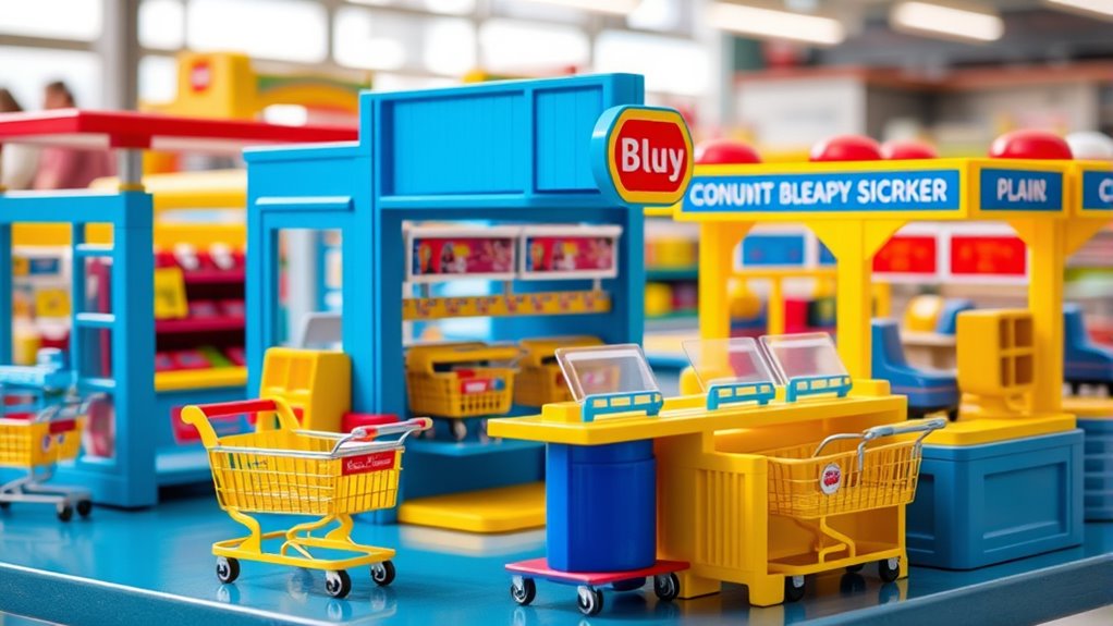 Bluey supermarket playsets meet strict safety standards like ASTM F963 and EN71, ensuring they’re safe for kids. I always check for non-toxic paints, sturdy construction, and rounded edges, which these sets have. They’re designed to withstand active play while keeping children safe. Rest assured, I’ve found these playsets to be reliable and safe, giving kids hours of fun without worries.