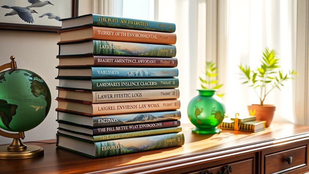 If you’re looking for essential environmental law books in 2025, I recommend starting with foundational works like “Natures Trust” and “Environmental Law: A Very Short Introduction” to grasp core principles. Practical guides such as “Preparing NEPA Environmental Assessments” and “Environmental Impact Assessment” will sharpen your skills, while case studies like “Fire Weather” and “Exposure” offer real-world insights. Don’t miss influential titles on sustainability and policy reform—there’s a lot to absorb to make a true impact. Keep going to uncover even more.