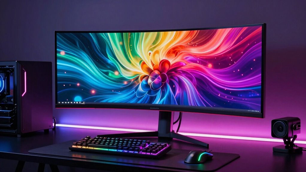A high refresh rate considerably enhances your gaming experience, making fast movements look smoother and more responsive. Monitors with 144Hz or higher deliver noticeably smoother motion, reducing motion blur during rapid action sequences. For competitive gaming, 180Hz or even 240Hz refresh rates can provide a real edge, ensuring quick reactions and fluid gameplay. The difference between 60Hz and higher refresh rates is significant, especially during fast-paced scenes, making high refresh rate monitors essential for serious gamers. Pairing these with low response times, ideally 1ms or less, minimizes ghosting and input lag. Combining high refresh rates with adaptive sync technologies like FreeSync or G-SYNC guarantees tear-free, seamless visuals, elevating your overall gaming experience and giving you a competitive advantage.