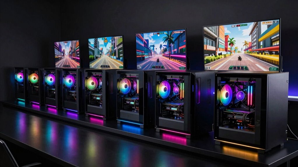 When choosing a high-end gaming PC, customization and aesthetic options play a crucial role in creating a setup that reflects your personal style and enhances your gaming environment. Many high-end models feature customizable RGB lighting, allowing you to sync effects with your games or mood. You can also choose case panels like tempered glass or RGB-lit front panels to boost visual appeal and showcase internal components. Software control systems such as MSI Center or Corsair iCUE make it easy to create dynamic, game-reactive lighting profiles. Additional aesthetic features—like dragon front panels, ARGB fans, and RGB keyboard/mouse integrations—help craft a cohesive, striking look. Selecting cases with transparent side panels or sleek finishes lets you display your custom lighting and internal setup, making your gaming station uniquely yours.