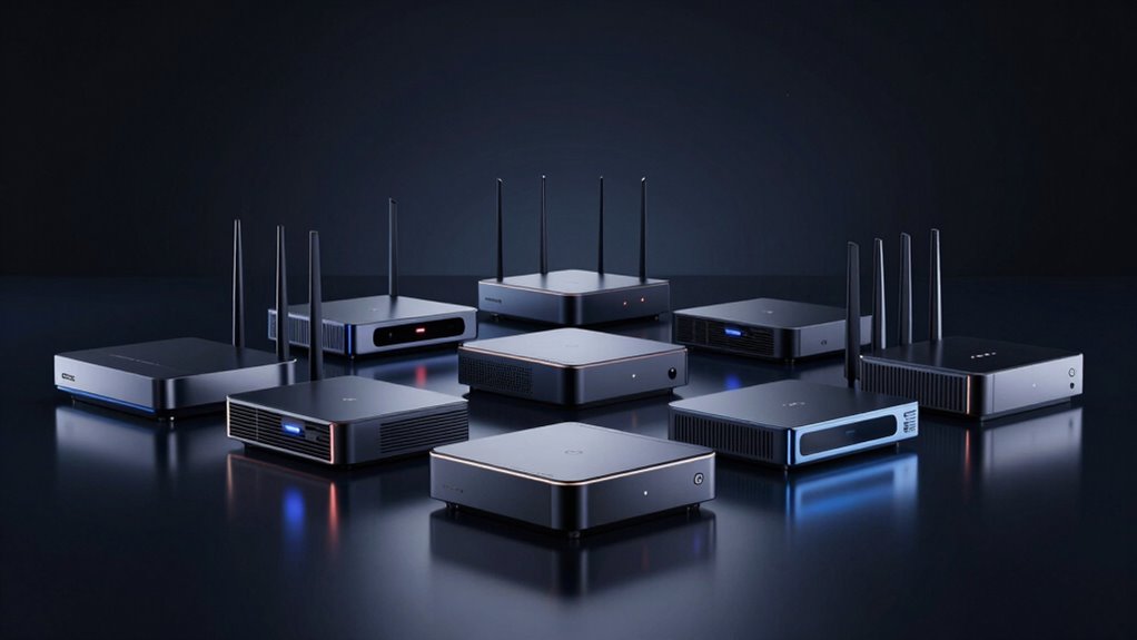 High-end routers deliver exceptional speed and bandwidth, making them ideal for demanding applications and multiple devices. With WiFi 6 and WiFi 7 standards, they can surpass 3.6 Gbps and reach up to 17 Gbps, ensuring lightning-fast wireless connections. Technologies like MU-MIMO and OFDMA allow these routers to efficiently serve many devices simultaneously, maximizing network capacity. For wired setups, they include multi-gig ports—2.5 Gbps or 10 Gbps—to support high-speed data transfers. Advanced features like 320 MHz channels and 4K-QAM modulation boost data throughput and cut latency, providing smoother streaming and gaming experiences. Multiple antennas, beamforming, and Multi-Link Operation further enhance performance, ensuring consistent high bandwidth over large areas. These elements make high-end routers powerful tools for future-proof, high-performance networks.