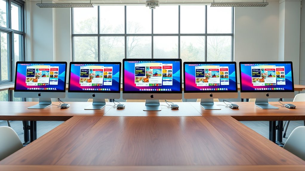 Ensuring privacy and security is crucial when choosing an iMac for classroom labs, as these systems handle sensitive student and staff data. Advanced privacy protections prevent unauthorized access, keeping student information confidential. Built-in security features like secure boot and hardware encryption defend against cyber threats, guaranteeing data stays safe. Privacy-focused features, such as app permissions and data access controls, help restrict unnecessary sharing in a classroom setting. Regular software updates and security patches are essential, as they fix vulnerabilities and defend against emerging cyber threats. Apple’s commitment to minimal data collection underpins their privacy policies, giving educators confidence that student and staff data remains protected. Prioritizing these security aspects ensures a safe digital environment for everyone involved.
