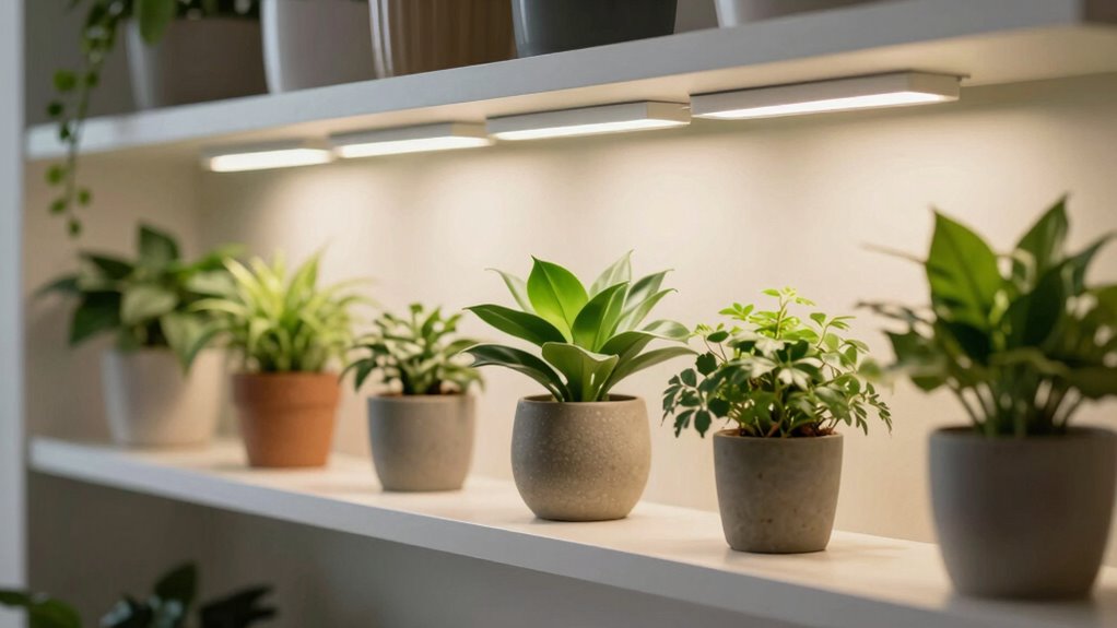 To determine the right light intensity for your shelf plants, I observe how they respond. If they look healthy and vibrant, your light is likely sufficient. If they’re stretching toward the light or look pale, I increase the intensity. I also consider the plant type—shade-loving plants need less light, while sun lovers crave more. Adjust gradually, and always watch your plants’ reactions to find the perfect balance.