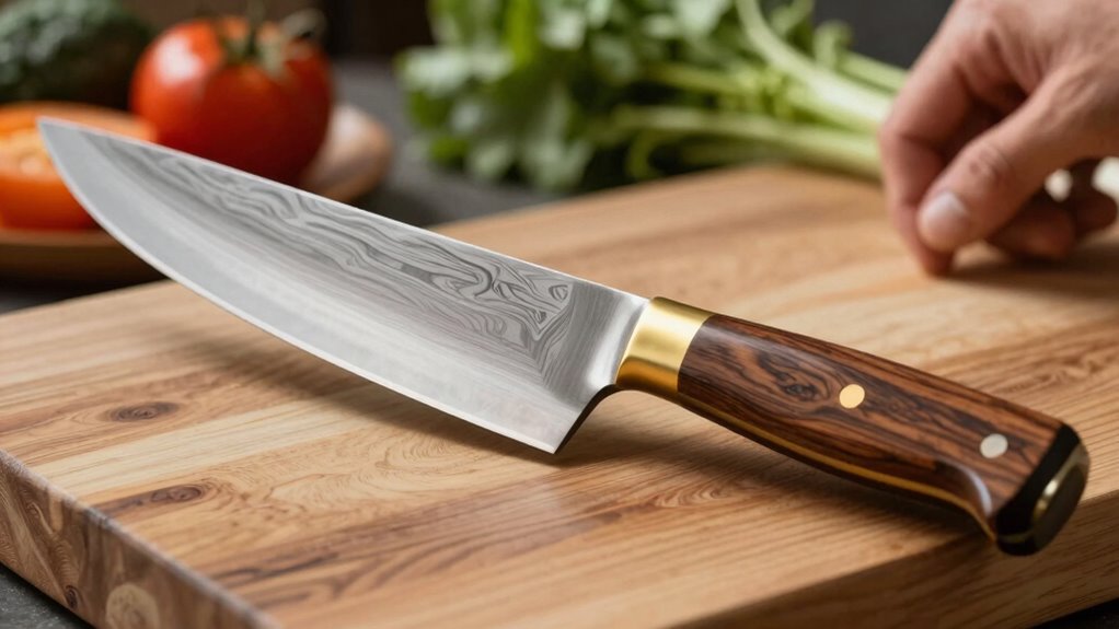 A handle that fits well in your hand can make all the difference in your kitchen performance. An ergonomic design reduces fatigue and gives you better control, especially during long prep sessions. Handles made from materials like pakkawood or rosewood feel comfortable and stay non-slip even when wet, ensuring safety. The shape, whether octagonal or rounded, should conform naturally to your grip, improving maneuverability. Proper balance between the handle and blade is essential to maintain stability and lessen strain during precise cuts. Textured or frosted handles provide extra grip security, which is especially useful in humid or greasy conditions. Choosing a handle that feels comfortable and secure helps you work more efficiently, confidently, and safely in the kitchen.