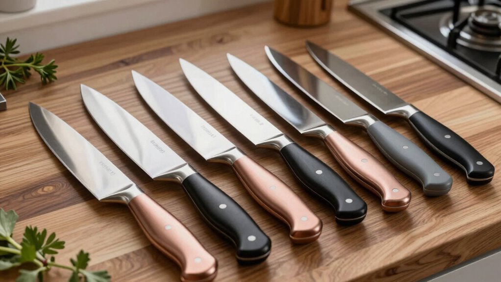 Choosing the right blade material is essential because it directly affects your knife’s sharpness, durability, and ease of maintenance. High-quality steels like Japanese stainless steel or German steel deliver better edge retention and toughness, making your knives last longer. The steel’s composition, such as 10Cr15CoMoV or 1.4116, influences corrosion resistance and overall performance. Blade hardness, measured in HRC, typically ranges around 58 HRC, balancing sharpness with toughness. The manufacturing process also matters—forged blades tend to be stronger and more durable than stamped ones. Additionally, coatings like non-stick or anti-rust finishes can boost corrosion resistance and simplify cleaning, but they might impact how easily you can sharpen the blade. Ascertain the right material ultimately ensures your knives perform well and stand the test of time.
