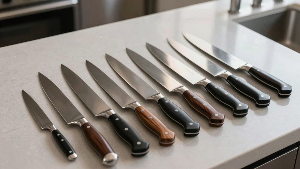 Choosing the right knife under $100 starts with understanding blade materials, as they directly impact sharpness, durability, and resistance to corrosion. High-quality blades are usually made from stainless steel, carbon steel, or ceramic, each offering different benefits. Stainless steel resists rust and is easy to maintain, while carbon steel can achieve a sharper edge but requires more care to prevent rust. Ceramic blades are extremely hard, stay sharp longer, and resist stains, but they’re more brittle. The hardness, measured on the Rockwell scale, typically ranges from 56-60 HRC, balancing sharpness and durability. Whether forged or stamped, the blade’s construction affects strength and performance. Also, consider the edge type—plain or serrated—depending on your cutting needs. Quality coatings can improve performance but shouldn’t compromise blade integrity.