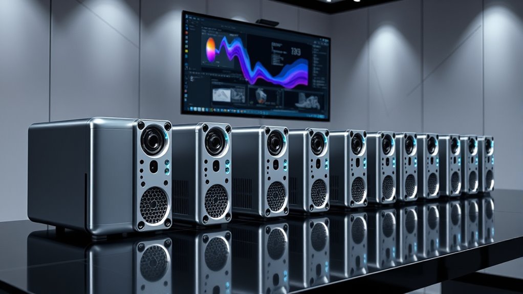 When selecting a Mac Pro for 3D rendering and simulation, display compatibility plays a crucial role in guaranteeing accurate visualizations and seamless workflows. I look for models that support high resolutions, like 6K or 8K, which are essential for detailed modeling and realistic rendering. It’s also important to verify that the Mac Pro has enough Thunderbolt 3 or 4 ports, or HDMI outputs, to connect multiple high-resolution monitors simultaneously. I ensure the graphics capabilities support HDR and wide color gamuts, which are vital for true-to-life visualizations. Additionally, I check if the output options are compatible with my existing or planned monitor setups, and confirm support for DisplayPort 1.4 or later standards to handle complex visual data smoothly.