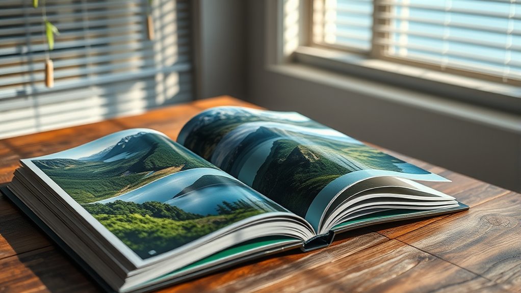 When selecting a nature photography coffee-table book, I look closely at image quality and resolution to guarantee stunning visuals. I also consider the content’s depth and variety to match my interests, along with the printing and material quality for durability. Finally, I think about the book’s size and theme to find the perfect fit for my space and preferences.
