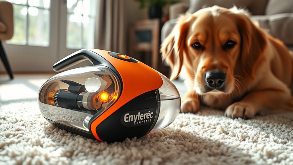 Maintaining a portable carpet cleaner for pets doesn’t have to be a hassle if you pay attention to its design and features. Look for models with self-cleaning functions or tools that make rinsing hoses and brushes quick and easy, saving you time. Removable tanks are essential—they should be simple to fill, empty, and clean to prevent mold and bacteria buildup. Accessible filters or parts that can be easily cleaned or replaced help keep the suction strong and cleaning effective. Durability matters too—choose units with corrosion-resistant components that can handle frequent use without damage. Clear, straightforward instructions for routine maintenance guarantee you stay on top of upkeep, extending the cleaner’s lifespan and keeping it performing at its best.