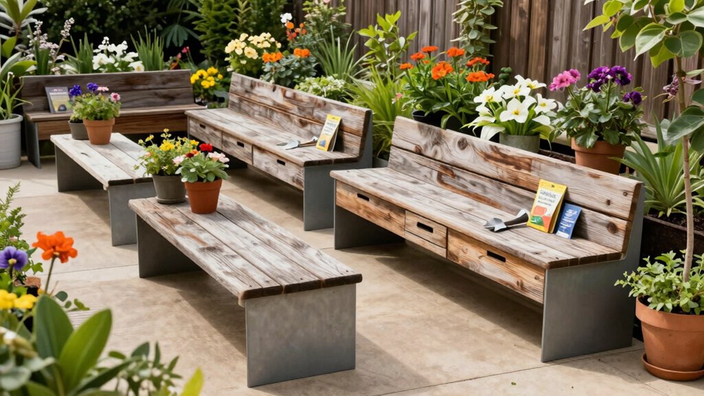 Choosing the right material for an outdoor potting bench depends heavily on its durability against the elements. I look for materials that resist warping, cracking, rust, and moisture absorption since these issues impact longevity and maintenance. Low-moisture cedar and dense fir are excellent choices—they’re less prone to warping or splitting over time, ensuring a stable workspace. Metal benches with rust-proof coatings or galvanized finishes resist corrosion, maintaining strength even in humid conditions. Plastic and composite options like HDPE are inherently resistant to rot, pests, and UV damage, making them durable for long-term outdoor use. When selecting a material, I prioritize those that can withstand various climate conditions while requiring minimal upkeep, ensuring my potting bench remains functional and attractive for years.