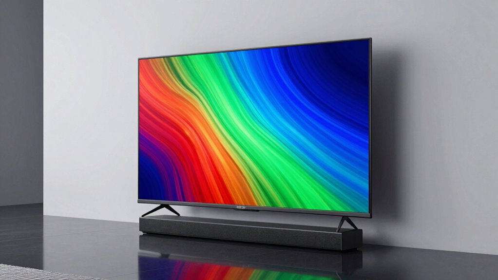 The sound quality of a QLED TV plays a essential role in delivering a truly immersive viewing experience, especially as visuals become more vivid. A top-tier model should incorporate advanced audio technologies like Dolby Atmos or DTS:X, which provide multidimensional sound that fills the room. Features like Object Tracking Sound are fundamental because they follow on-screen movement, making audio more realistic and engaging. The placement and number of speakers also matter, as they directly affect clarity and the richness of sound. Additionally, built-in AI-based sound optimization adjusts audio dynamically based on content, enhancing clarity. For seamless integration, look for connectivity options such as HDMI eARC or Bluetooth, allowing you to easily connect external soundbars or home theater systems for an even better audio experience.