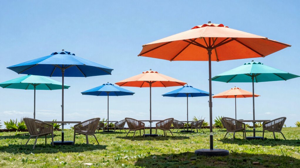 When selecting a reef-safe outdoor umbrella, considering its size and portability is essential to match your outdoor needs. Umbrella sizes vary from compact 42-inch models perfect for personal shade or travel, to large 9-foot canopies that cover groups comfortably. Lightweight materials like fiberglass or aluminum frames make portable options easier to carry, especially during outdoor activities. Foldable designs with auto open/close features allow quick setup and easy storage, enhancing convenience. Smaller umbrellas are ideal for solo use or travel, while larger ones provide broader UV protection for gatherings. Carrying cases or bags further boost portability, making these umbrellas great for frequent outdoor use or adventures. Choosing the right size and portability guarantees comfort, ease, and effective UV coverage wherever you go.