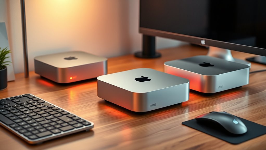 If you’re looking for the best renewed Mac Mini desktops of 2025, I recommend considering options with the M4 and M4 Pro chips for powerful performance and efficiency. These models offer sleek designs, support multiple high-res displays, and run quietly, making them ideal for demanding workflows. With choices featuring up to 2TB SSD and 24GB RAM, they’re great for creative and professional tasks. Continue onward to uncover which models truly stand out in quality, power, and value.