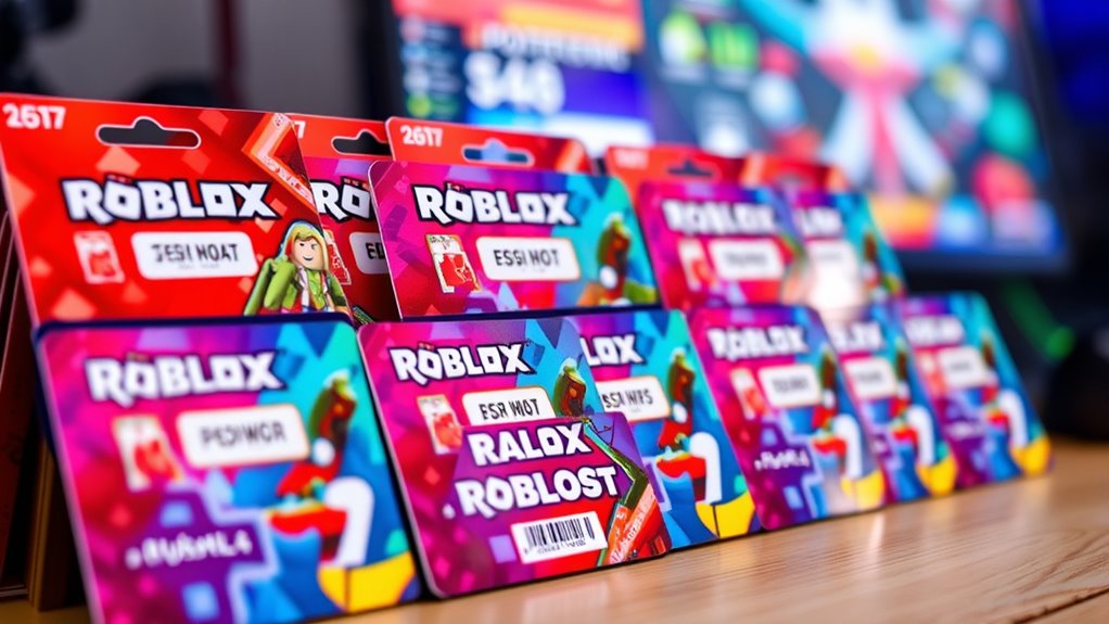 Have you ever wondered how to choose the right gift card value for Roblox? It’s important to pick a amount that aligns with your spending goals. Smaller options, like 1,000 Robux, are perfect for casual players or quick purchases, while larger cards, such as 60,000 Robux, offer better value with bonuses up to 25%. If you’re gifting, a higher denomination like $50 or more can make a big impact and cover multiple virtual items. Consider how much the recipient typically spends and what they want to buy in Roblox. Some cards are designed for specific amounts, so selecting the right value helps avoid partial redemptions or insufficient funds. Matching the card value to intended use guarantees a smooth, satisfying shopping experience.