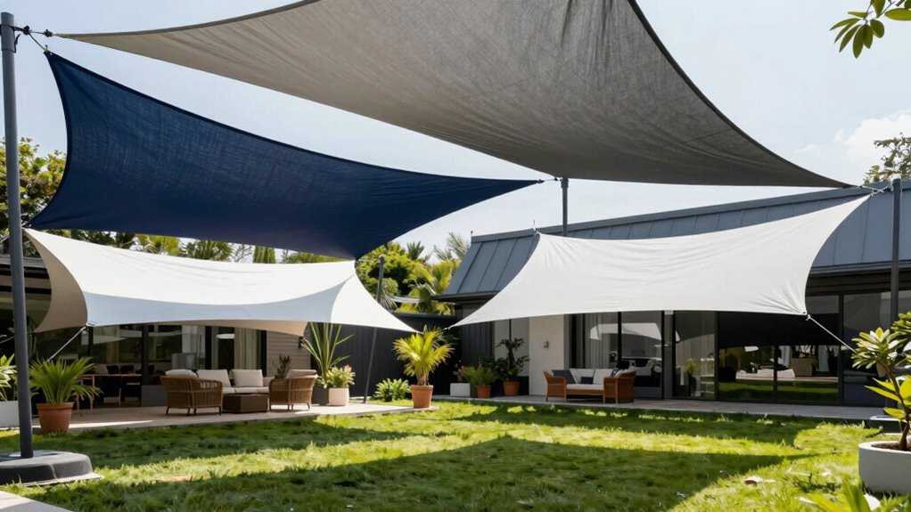 Choosing the right material for your shade sail is vital because it directly impacts how long it will last and how well it can resist the elements. High-density polyethylene (HDPE) stands out for its superior tear and UV resistance compared to recycled fabrics, making it a durable choice. Reinforced webbing and double-stitched seams further boost longevity by preventing fraying and tearing over time. Using stainless steel D-rings and rust-resistant hardware ensures your sail remains secure and corrosion-free in different weather conditions. Additionally, UV stabilization treatments and extensive lab testing help the fabric resist fading, cracking, and deterioration caused by prolonged sun exposure. Proper installation—correct tensioning and best possible angling—also plays an important role in reducing stress on the fabric and hardware, extending the lifespan of your shade sail.