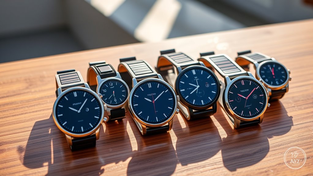 Choosing a solar-powered smartwatch requires paying attention to several key factors that influence how well it captures and uses sunlight. The size and quality of the Power Glass lens play a vital role, as larger, high-quality lenses can gather more sunlight and extend battery life. Placement and orientation also matter—wearing the watch where it can face direct sunlight maximizes charging speed. These watches work best when exposed to at least 50,000 lux, similar to bright outdoor conditions, for about three hours daily. However, solar efficiency drops indoors or on cloudy days, reducing battery benefits. Many advanced models include energy management features that optimize power consumption, ensuring you get the most from solar charging even in less-than-ideal conditions.
