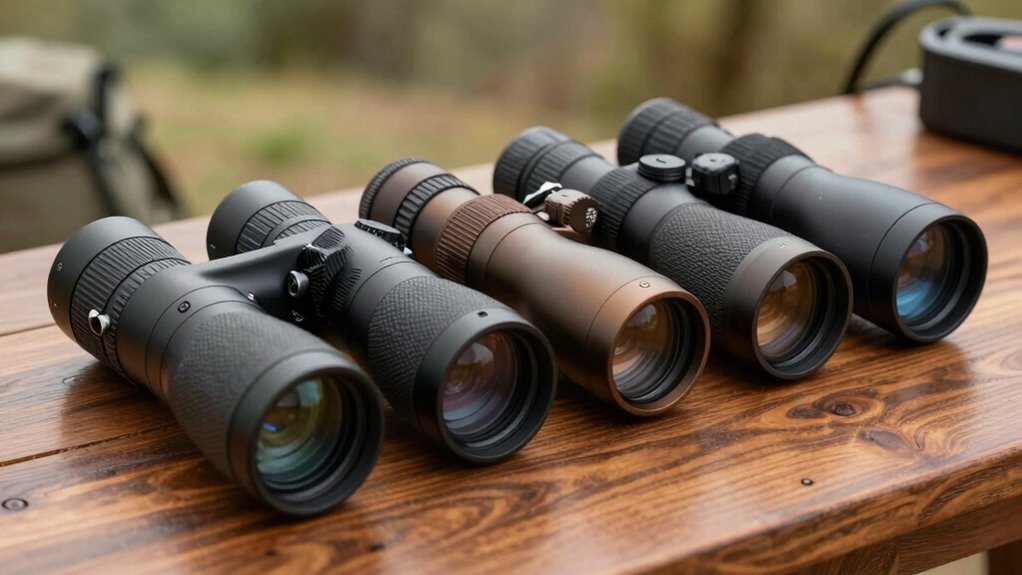Ever wonder how some spotting scopes deliver crisp, bright images even in challenging lighting conditions? The secret lies in the quality of their optical coatings. Fully multi-coated lenses, or FMC coatings, involve multiple layers on all lens elements, boosting light transmission and reducing glare. This results in brighter, clearer images, especially when light is limited, like at dawn or dusk. Coatings on BAK4 prisms further improve light reflection and color fidelity, enhancing overall image quality. High-quality coatings also cut down internal reflections, increasing contrast and sharpness across various lighting scenarios. When choosing a scope under $2000, look for FMC coatings, as they guarantee maximum light throughput and better low-light performance, giving you more detail and clarity in every viewing situation.