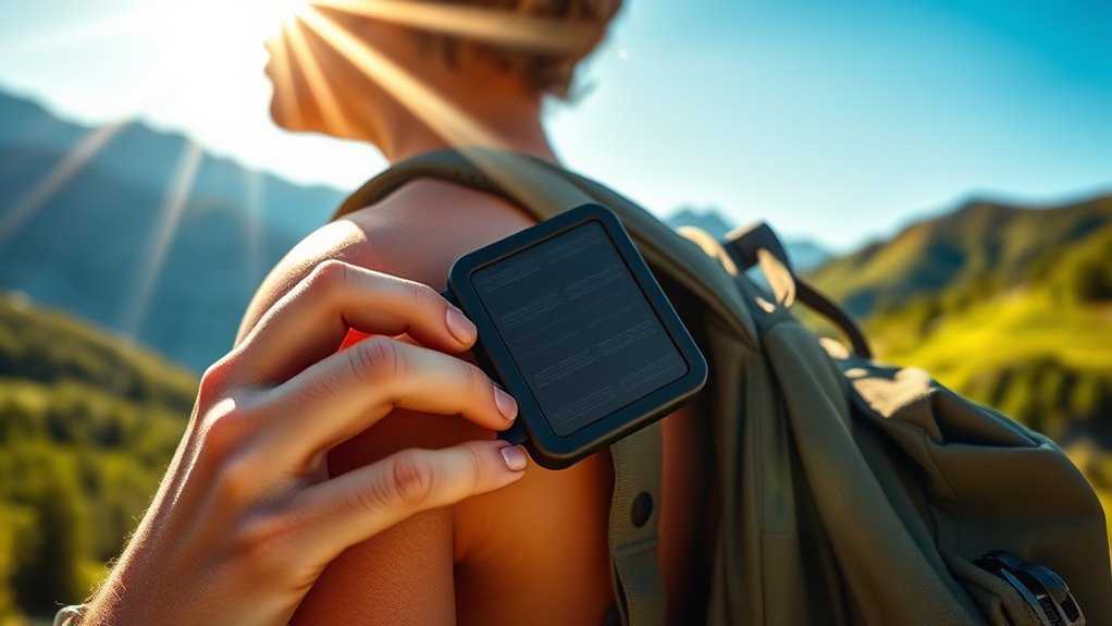 Choosing a wearable solar charger that can withstand the elements is essential for reliable outdoor use. I look for devices with an IP67 rating or higher, ensuring protection against water, dust, and shocks. Durable materials like rugged silicone, thermoplastic polycarbonate, or ABS plastics are key, as they resist harsh weather and rough handling. The solar panels should be weatherproof, with sealed edges and protective coatings to prevent moisture and debris damage. I also prioritize chargers that resist extreme temperatures, functioning well from -20°C to 60°C. Reinforced corners or rubber bumpers add shockproof and drop-resistant features, safeguarding the device during outdoor activities. These factors help ensure my solar charger remains dependable, no matter the environment.